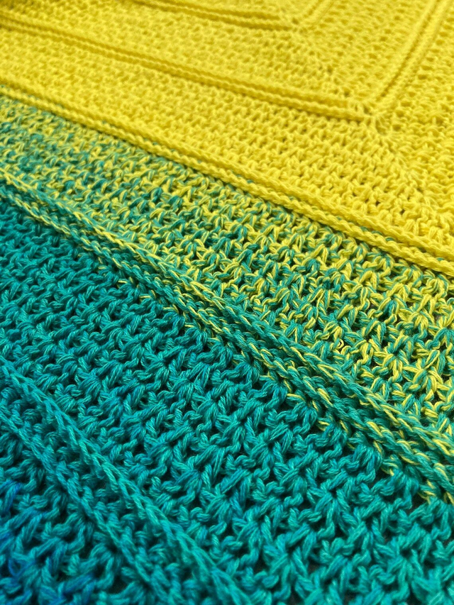 This bright, unique shawl has been crocheted by hand from Cotten Kings Sultan 100% cotton yarn. The ombré blends from yellow to turquoise to blue, reminiscent of waves lapping at a tropical beach. The shawl can be worn in multiple ways to show off the ombré effect best.